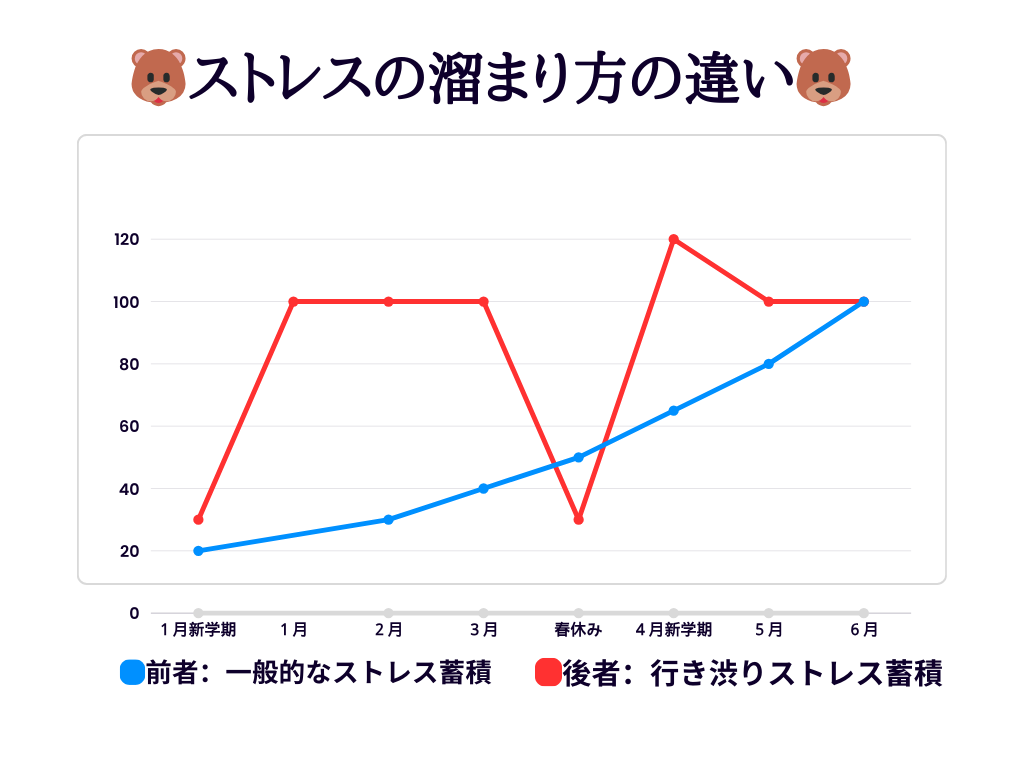 正しくは、学期始めにストレスは急上昇し、ハイストレスのまま走り続けて心身が壊れた。